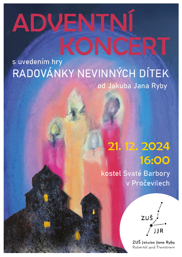 Letošní advent završíme koncertem v pročevilském barokním kostele sv. Barbory, kde se představí i spolupráce mezi literárně-dramatickým oborem a Flétnovým souborem, kteří v premiéře představí Rybův dramatický text "Radovánky nevinných dítek o Vánocích" z roku 1804.